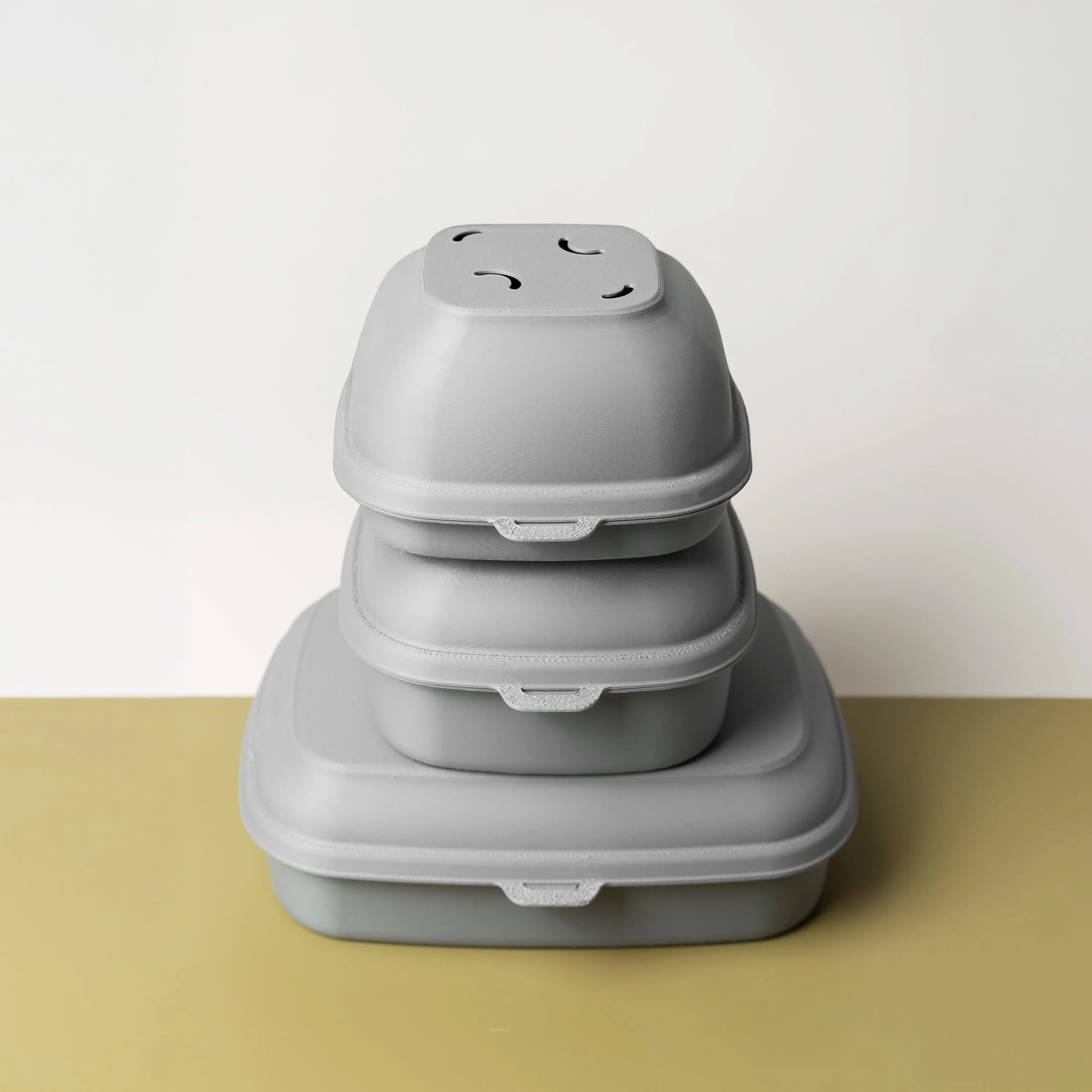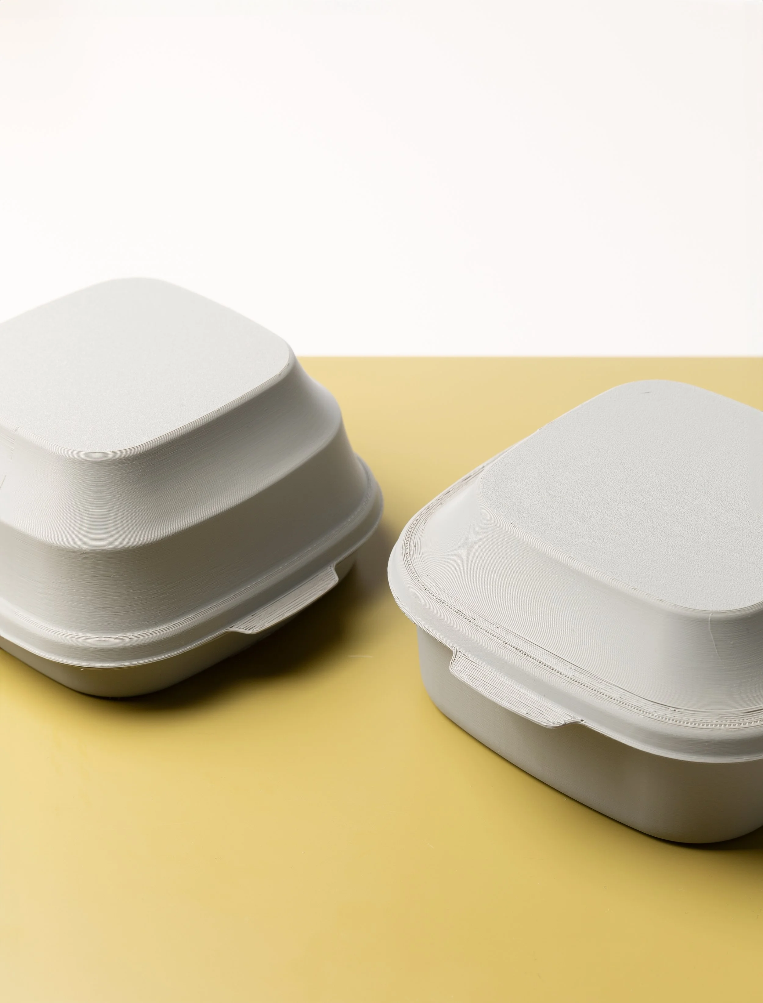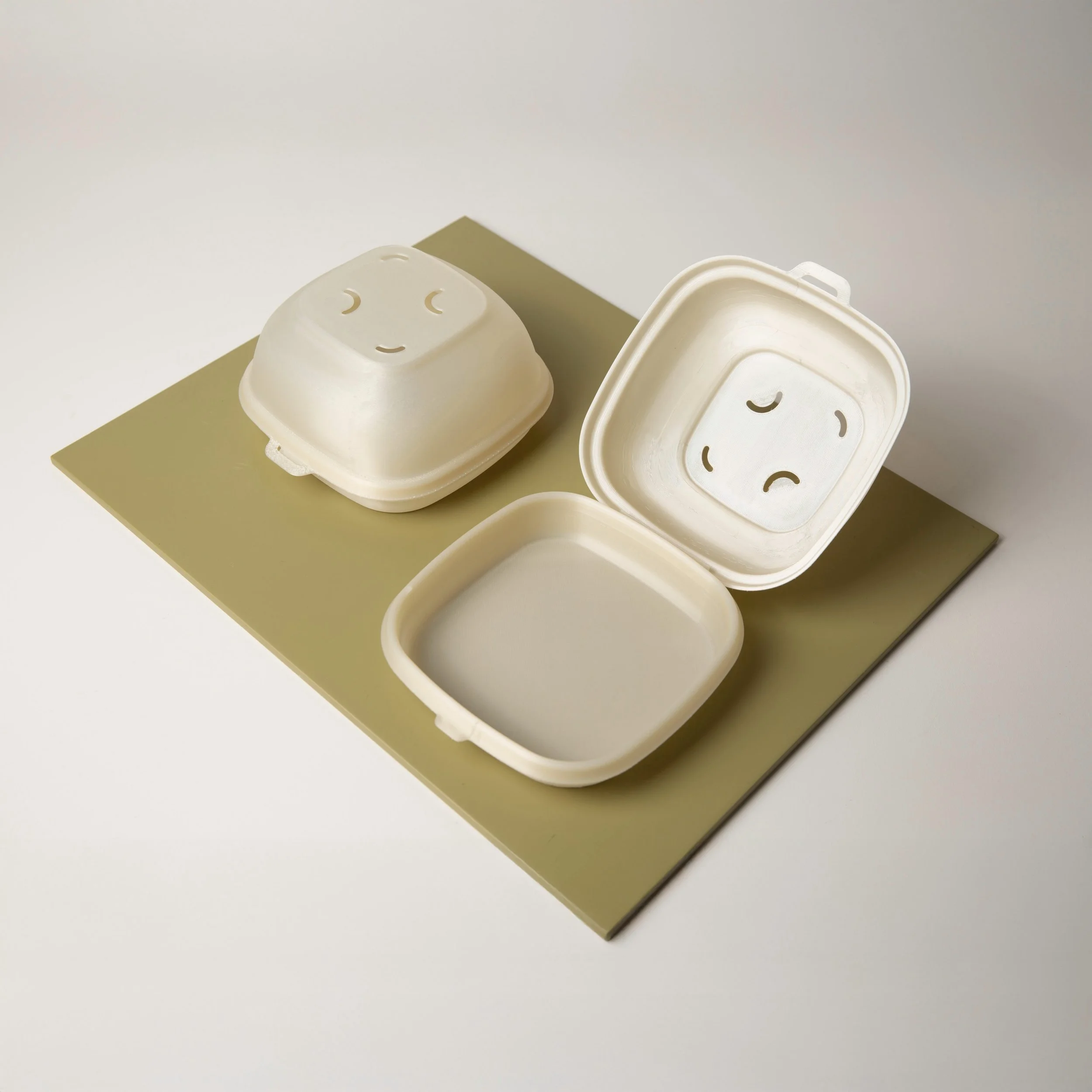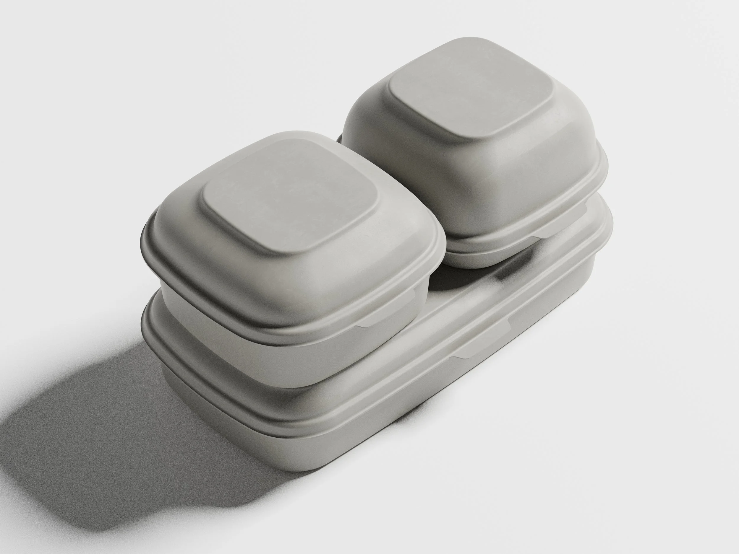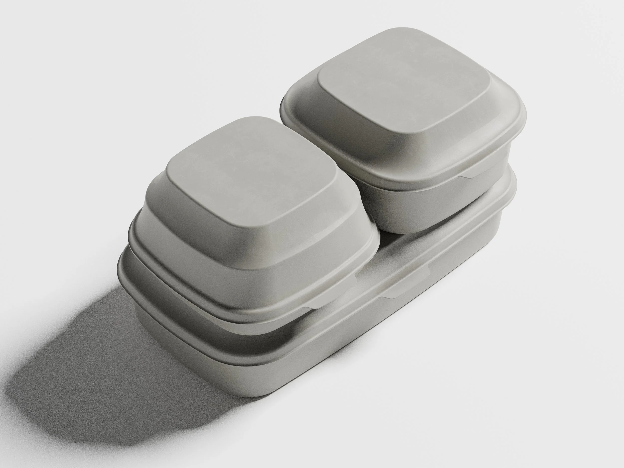 NMASA Design led the strategic and creative development of a new packaging system made from biodegradable and reusable bioplastic materials. The studio carried out market research, analysed food delivery trends, reviewed competing packaging formats and studied the operational needs of restaurants. Based on this work, NMASA designed a family of containers for burgers, fries, salads and other meals, with forms inspired by refined tableware rather than disposable takeaway boxes. In parallel, Carolin Liebl and Nikolas Schmid-Pfähler investigated the decomposition behaviour of selected bioplastics, helping the client better understand material performance and end of life scenarios.