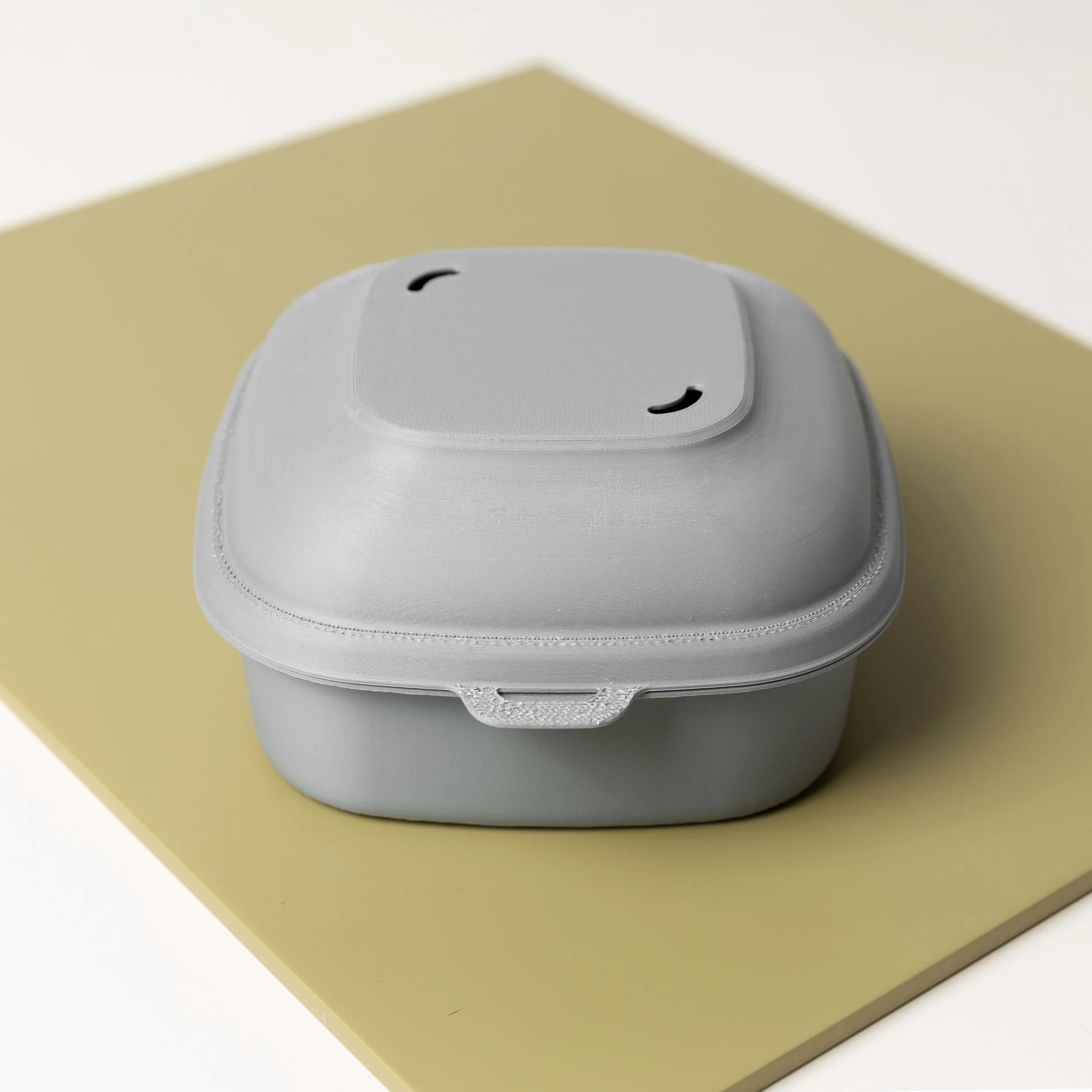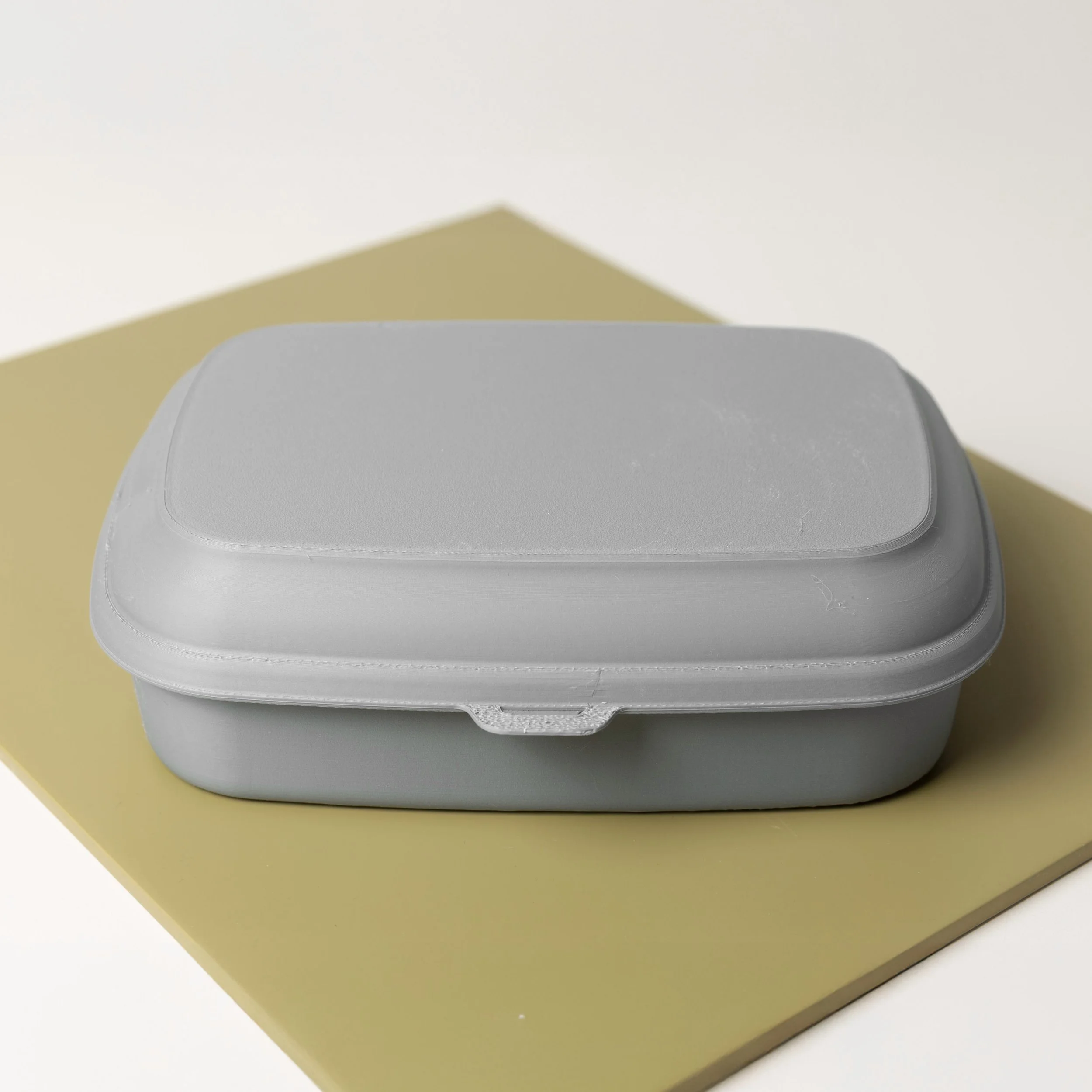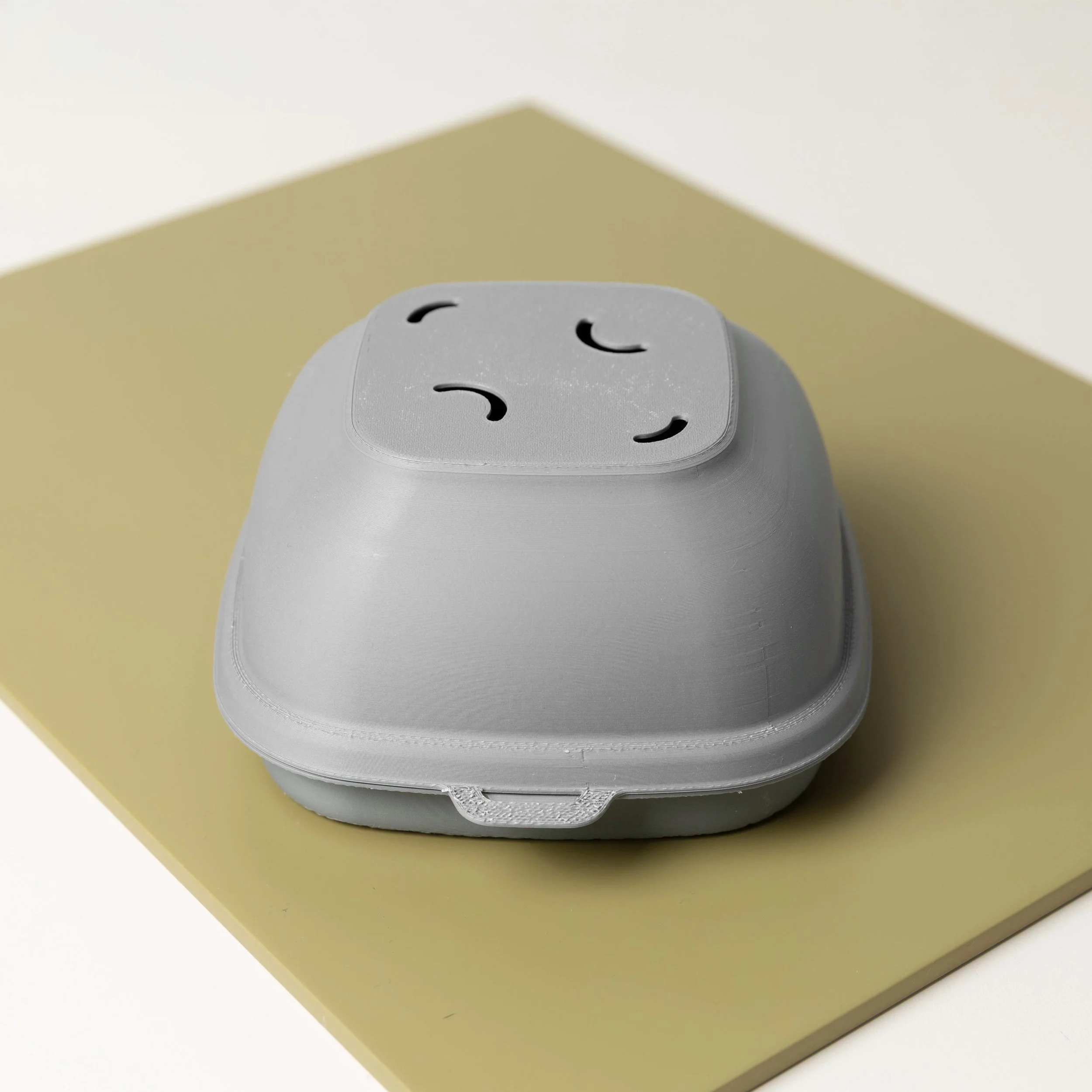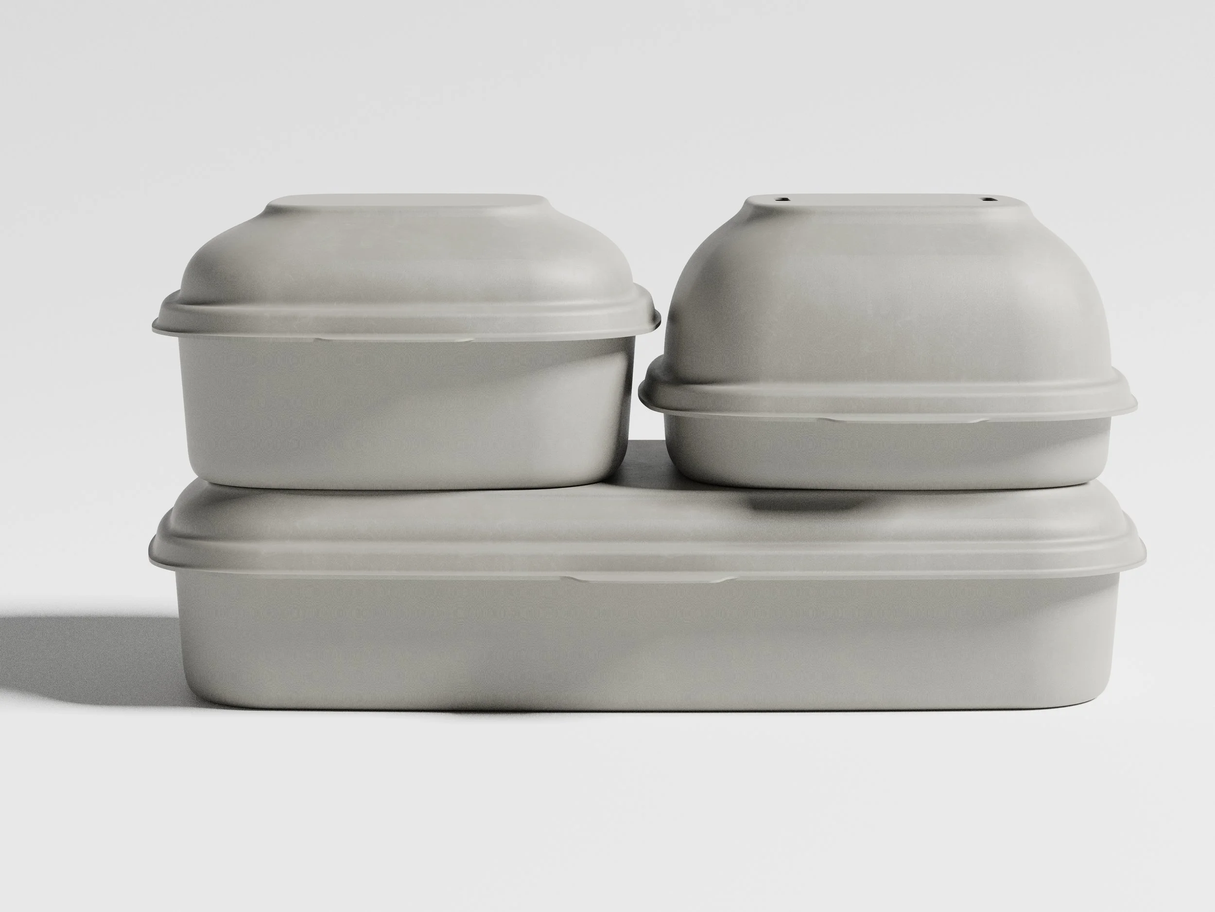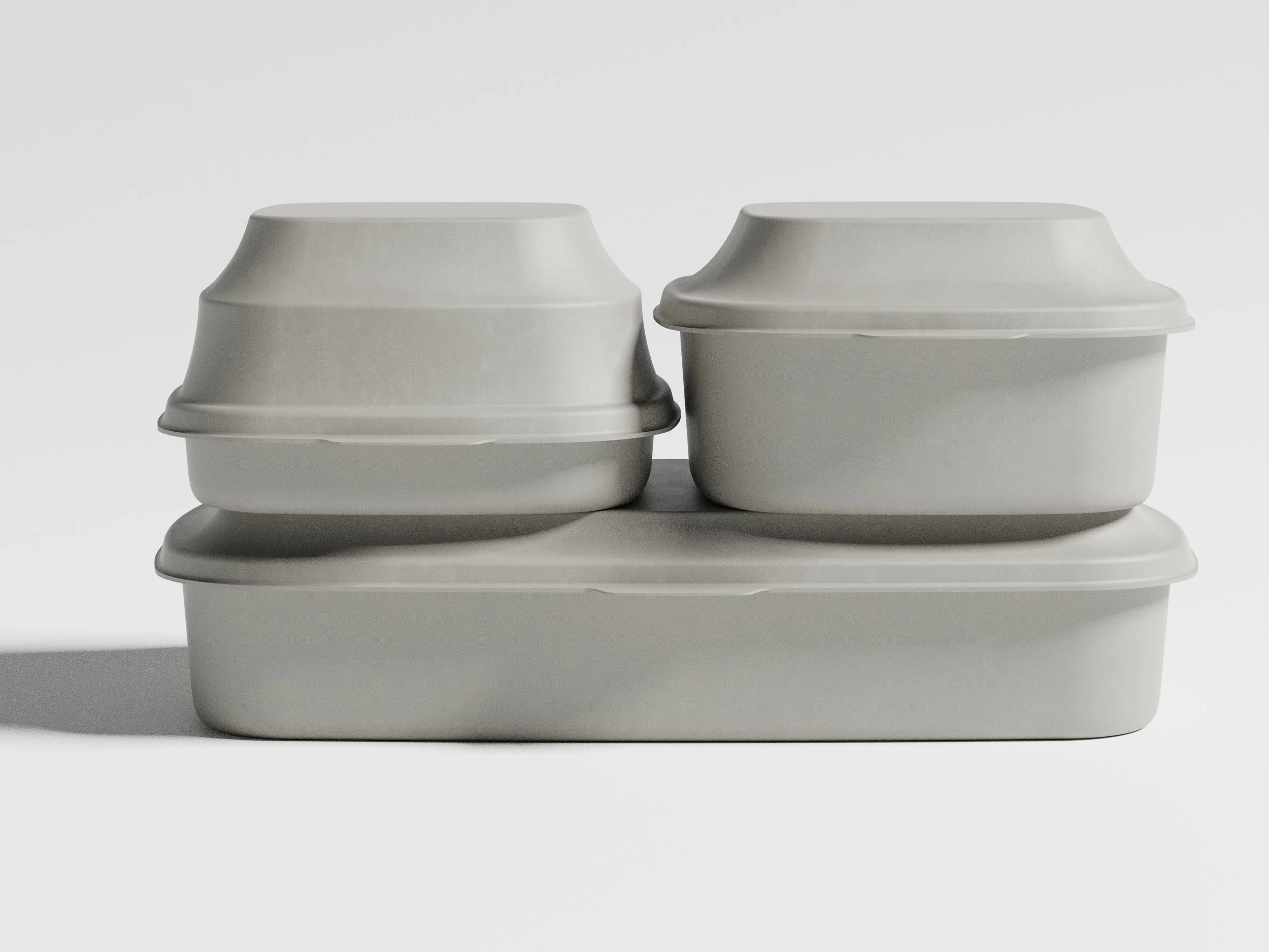 NMASA Design led the strategic and creative development of a new packaging system made from biodegradable and reusable bioplastic materials. The studio carried out market research, analysed food delivery trends, reviewed competing packaging formats and studied the operational needs of restaurants. Based on this work, NMASA designed a family of containers for burgers, fries, salads and other meals, with forms inspired by refined tableware rather than disposable takeaway boxes. In parallel, Carolin Liebl and Nikolas Schmid-Pfähler investigated the decomposition behaviour of selected bioplastics, helping the client better understand material performance and end of life scenarios.